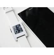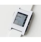 След известно забавяне, година по-късно, часовникът, който изглежда съвсем нормално и може лесно да бъде объркан с обикновен, вече е в ръцете на подкрепилите кампанията, а освен това вече започнаха и продажбите му в магазини в Щатите. Стигна и до българите, повярвали в проекта, което ни даде възможност да го изпробваме. Първите впечатления са положителни - Pebble не е чак толкова голям, колкото другите подобни предложения, макар че е сравнително дебел, но това е цената, която плащаме, за да поставим малък компютър на ръката си. Изработен е от пластмаса, което го прави изненадващо лек, а тъй като няма сензорен екран, управлението му се извършва чрез 4 бутона върху корпуса. Трите отдясно служат за превъртане на съдържание и за извикване и селектиране в менюто, а този върху лявата страна е за връщане назад. Под него са поставени и контактите за зареждане, които се използват от добавеното в комплекта магнитно зарядно, което може да се включи в компютърен USB порт или в зарядно с такъв. Според компанията батерията издържа повече от седмица на автономна работа и по време на тестовете така и не успяхме да я изчерпим. За производителността се грижи ARM процесор Cortex-M3.Часовникът е херметически затворен и не осигурява лесен достъп до вградената батерия, а добрата изолация позволява и ползването му във вода (до 5 ATM). Бутоните са големи и удобни (може би трябваше да бъдат и с текстурирана повърхност), но в същото време изискват малко по-голяма от очакваното сила за натискане. Каишката е със стандартната ширина от 22 мм, което позволява да я смените с друга по-избор. Изработена е от изключително мек материал, което на свой ред гарантира и комфорта при носене на часовника върху китката. Джаджата се предлага в няколко различни цвята.