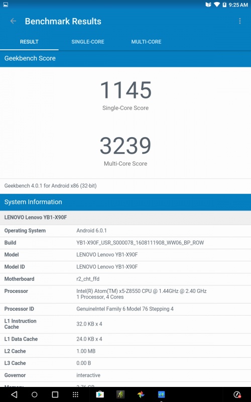 В тънкия корпус са поместени четириядрен процесор Intel Atom x5-z8550 с честота 1.44GHz (с турбо честота до 2.40 GHz), 4GB RAM и 64GB разширяема памет, които осигуряват пъргава работа и безпроблемна многозадачност с бързо превключване между различни приложения, така че в това отношение определено няма за какво да се притеснявате. Доброто представяне продължава и при разглеждане на сайтове с Chrome с плавно превъртане и мащабиране на страниците. Въпреки извънредно тънкия си профил, Yoga Book предлага батерия с капацитет 8500 mAh, който според Lenovo стига за около 15 часа на автономна работа и това до голяма степен е вярно. С нашата употреба установихме, че спокойно можем да ползваме таблета няколко дни в кратки сесии с различна продължителност за сърфиране в интернет, писане на кратки текстове, гледане на видео, слушане на музика и ползване на стилуса за записки и скици.