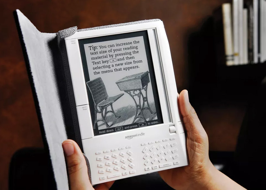 През есента Amazon представя Kindle - специализирано устройство за четене на електронни книги, което въпреки цената от 399 долара се разпродава за броени часове и минават месеци, преди да бъде налично отново. Джаджата предлага 6" E Ink дисплей и има 250 МВ разширяема памет, жак за слушалки и 3G достъп на територията на Щатите за покупка и изтегляне на книги.