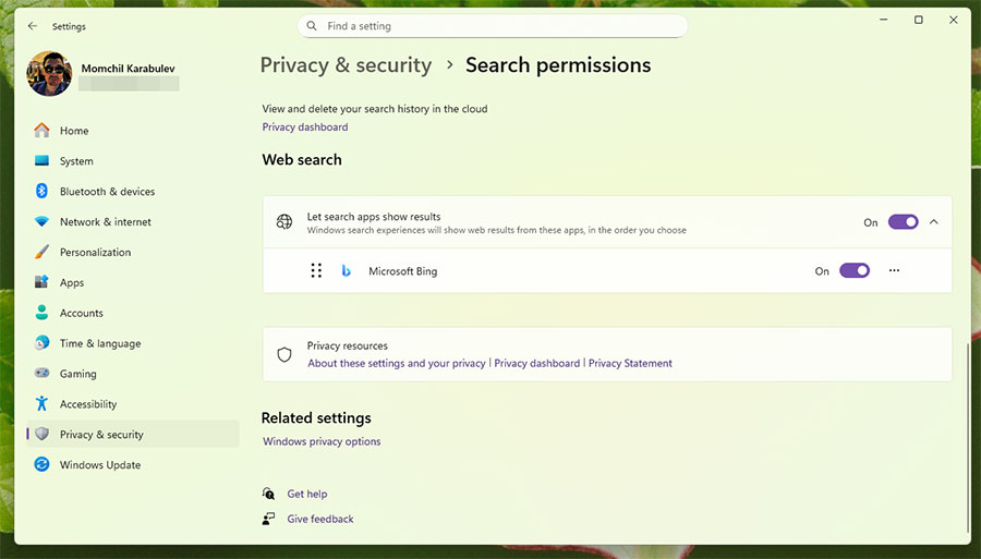 Във версията на Windows 11 за Европа потребителите могат да сменят Bing с друг доставчик на търсене от Settings > Privacy & security > Search permissions (Настройки > Поверителност и сигурност > Разрешения за търсене) и след това активиране на Let search apps show results (Позволете на приложенията за търсене да показват резултати).