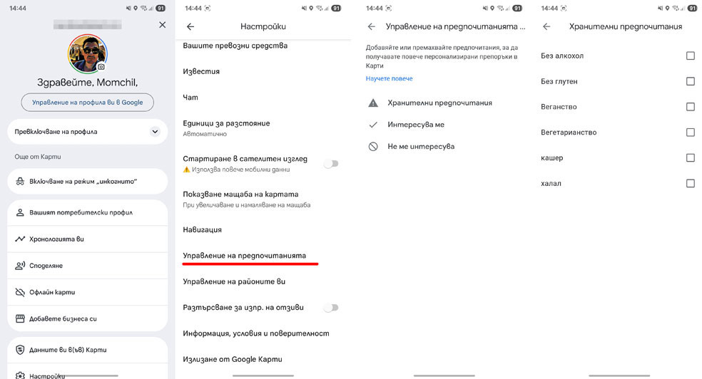 – Изберете Управление на предпочитанията и след това натиснете Хранителни предпочитания.