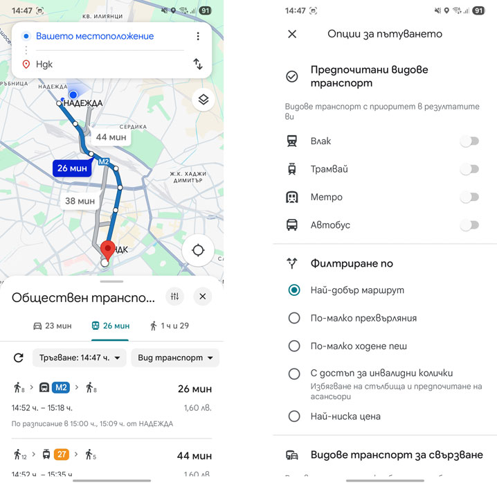 – Задайте предпочитанията си – например по-малко прехвърляния, по-малко ходене пеш, достъп за инвалидни колички, както и предпочитани видове транспорт и Maps ще коригира предложените маршрути.