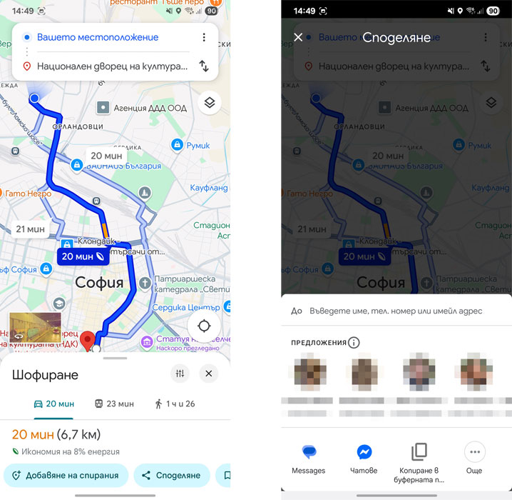 Споделеният текст включва връзка в края. Когато получателят я натисне, Google Maps се отваря и започва навигацията, което улеснява следването на маршрута.