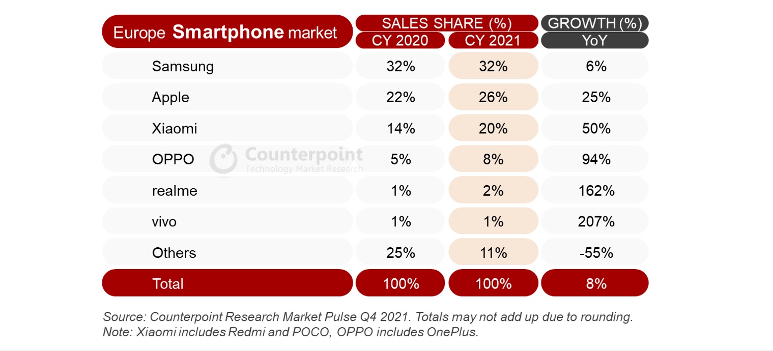 Миналата година бележи възстановяване на пазара за смартфони, това важи и на регионално ниво за Европа. Данни на Counterpoint Research сочат, че тук е отбелязан ръст от 8% спрямо тежката 2020. Анализаторите отбелязват, че възстановяването е по-слабо заради недостига на компоненти.