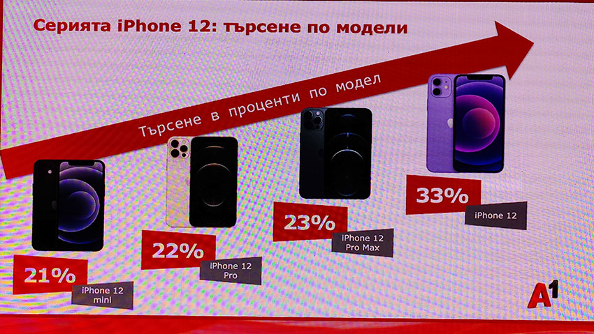 Александър Колев сподели и интересни данни за продажбите на серията iPhone 12. От тях става ясно, че най-търсен е iPhone 12 с 33% общите продажби. Следват iPhone 12 Pro Max с 23%, iPhone 13 Pro с 22% и iPhone 12 mini с 21%. Говори се, че догодина Apple няма да предложи mini модел заради слабо търсене, но излиза, че в България продажбите му не са никак малки.
