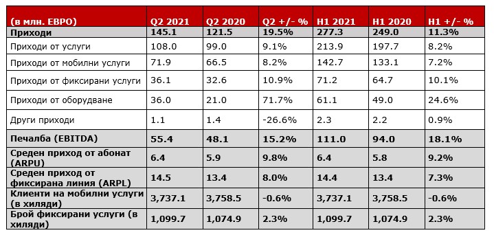 Прави впечатление, че приходите от мобилни и фиксирани услуги са се увеличили с 9.1% до 108 милиона евро, което компанията отдава на продължаващата позитивна тенденция в мобилния и фиксирания сегмент и при продажбите на устройства. Приходите от оборудване са се увеличили със 71.7% до 36 милиона евро.