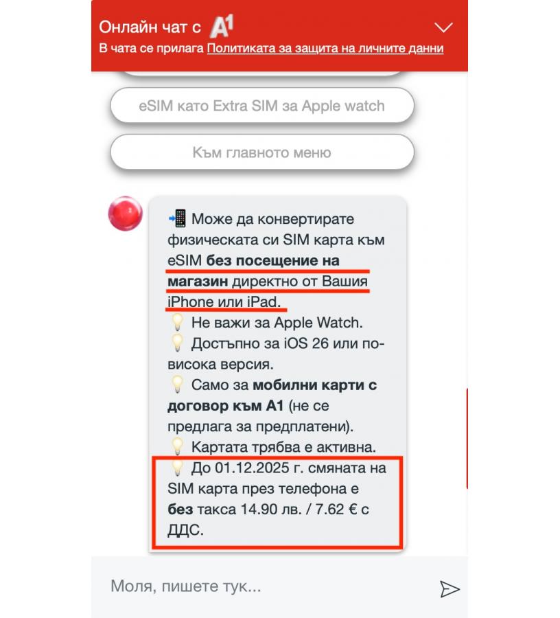 Ако сте абонат на A1 с iPhone или iPad - вече можете да конвертирате вашата физическа SIM карта в eSIM директно от менюто на телефона. Това коментират потребители в нашия форум, а според скрийншот от чат с поддръжката на A1, това ще е безплатно до 1 декември 2025 (иначе струва 14.90 лв / 7.62 €).