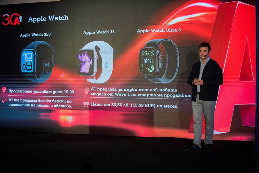 Александър Колев, мениджър „Управление на продуктово портфолио и аксесоари“, представи данни за пазара на мобилни устройства и аксесоари в България. Той демонстрира най-новата серия смартфони на Apple iPhone 17, чиито официални продажби стартираха на 19 септември. Той подчерта, че най-нетърпеливите почитатели на марката могат да ги закупят още през първия уикенд в магазините на А1 в моловете в София, Пловдив, Варна, Бургас и Велико Търново.