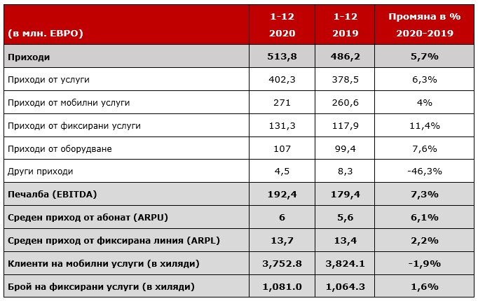 Приходите от мобилни и фиксирани услуги се увеличават с 6.3% до 402.3 млн. евро спрямо същия период за 2019 г., а общите приходи нарастват с 5.7% до 513.8 млн. Евро. Печалбата преди данъци, такси, лихви и амортизация (EBITDA) възлиза на 192.4 млн. евро, което е ръст със 7.3% на годишна база. Фиксираните услуги регистрират най-силен ръст и през 2020 година – с 11.4% до 131.3 млн. евро.