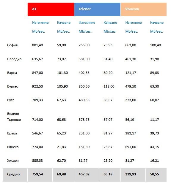 Организацията е установила, че при тестовете А1 е постигнала най-високи средни скорости на изтегляне на данни - 759 Mbps. Следват Telenor с 457 Mbps и VIVACOM с 340 Mbps. Скоростите на изпращане на данни са съответно 69 Mbps при А1, 63 Mbps при Telenor и 50 Mbps при VIVACOM. Отчетените скорости в различните градове можете да видите в тази таблица, но освен тях "Активни потребители" дава данни и за регистрираните най-високи и най-ниски скорости на трансфер за всеки оператор.