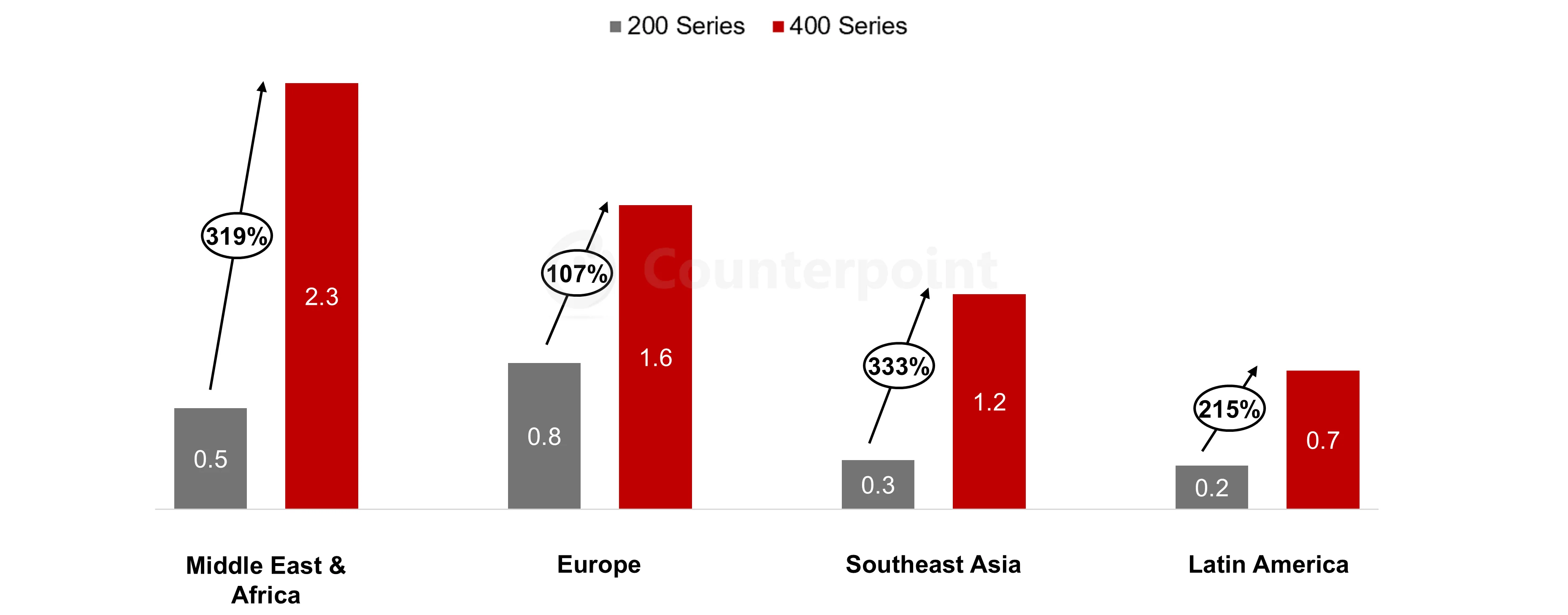 Ключова тенденция през 2025 г. беше растежът на сегмента на достъпните флагмански модели (цена на едро 700–999 долара). В световен мащаб това е най-бързо растящият сегмент през миналата година с ръст на продажбите 25% спрямо 2024 г. Този растеж е движен от три региона – Близкия Изток и Африка, Южна Америка и Европа – където сегментът е нараснал съответно с 54%, 34% и 33% през 2025 г.