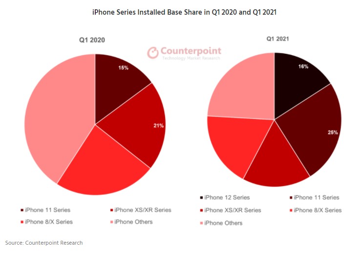 Делът на серия iPhone 11 през първото тримесечие на миналата година е 15%, а на iPhone 12 за тримесечието през настоящата година е 16% от всички серии на компанията. Припомняме, че премиерата на iPhone 12 беше с един месец по-късно от традиционното. Сред вътрешната конкуренция на актуалната серия е и по-достъпният iPhone SE 2020.