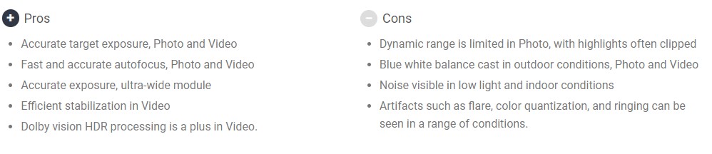 Налични са и някои недостатъци. Те включват ограничен динамичен обхват при снимки, наличието на шум при снимане на закрито и при ограничена околна светлина, както и артефакти при редица условия.