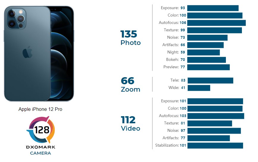 Apple iPhone 12 Pro получава общ резултат от 128 точки (135 точки за снимки, 66 за зуум и 112 за видео), като по този начин дели четвъртото място с Xiaomi Mi 10 Pro. Моделът изостава с няколко точки от трите телефона начело на класацията, Huawei Mate 40 Pro, Mi 10 Ultra и P40 Pro, които имат съответно 136, 133 и 132 точки.