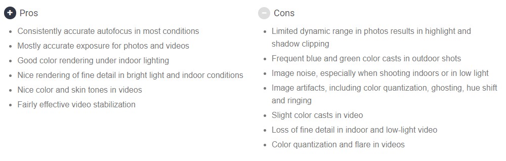 Сред отчетените плюсове са точен автофокус при повечето ситуации, предимно точна експозиция при снимки и видео и добро пресъздаване на цветовете на закрито и при изкуствена светлина. При видео се отчитат приятни цветове и тонове на кожата, а стабилизацията е относително ефективна.