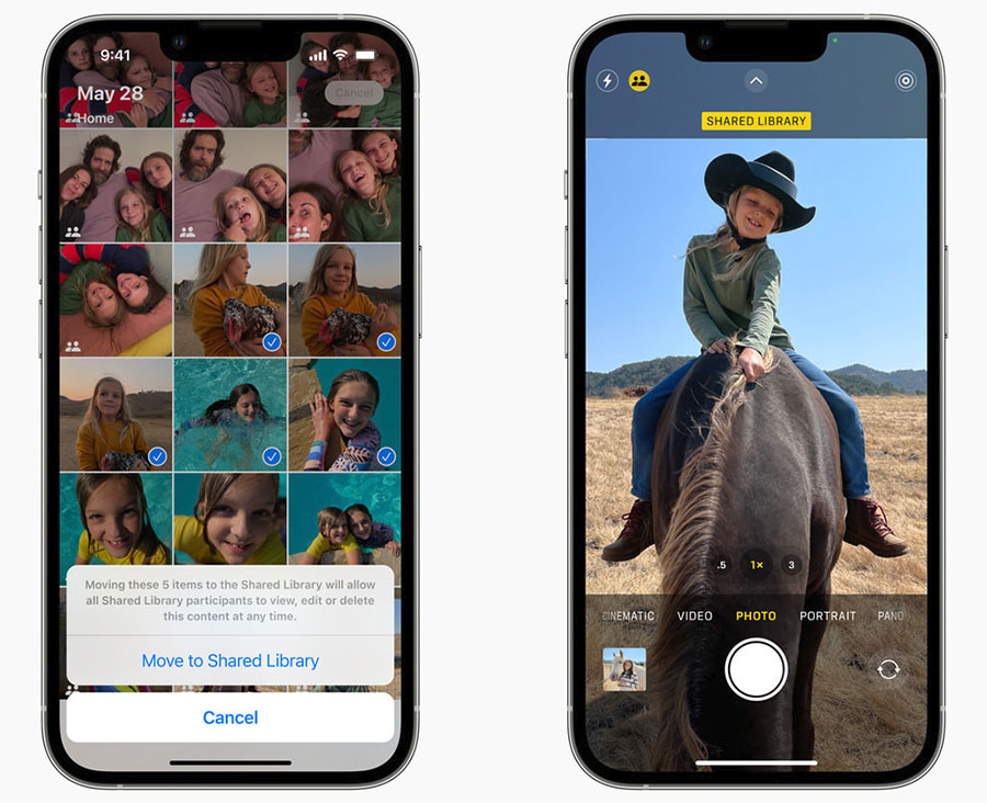 iCloud Shared Photo Library осигурява нови възможности за споделяне на снимки и видео в една iCloud галерия от до 6 различни потребители. Разположение са различни опции като добавяне на съдържание от личните им галерии или споделяне на базата на стартова дата или на хората в снимките. Споделянето може да стане и автоматично чрез бутон в приложението Camera.