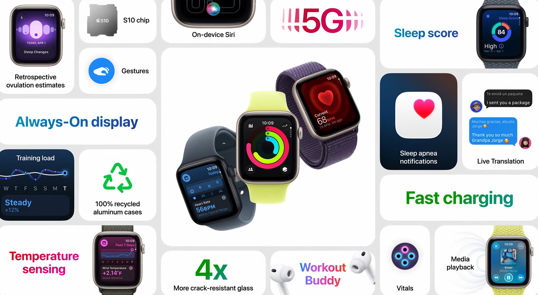 Тези функции се допълват от вече наличните възможности като мониторинг на сърдечната дейност, Cycle Tracking и известия за нива на физическа активност, както и от системи за сигурност – Fall Detection, Crash Detection и Emergency SOS.