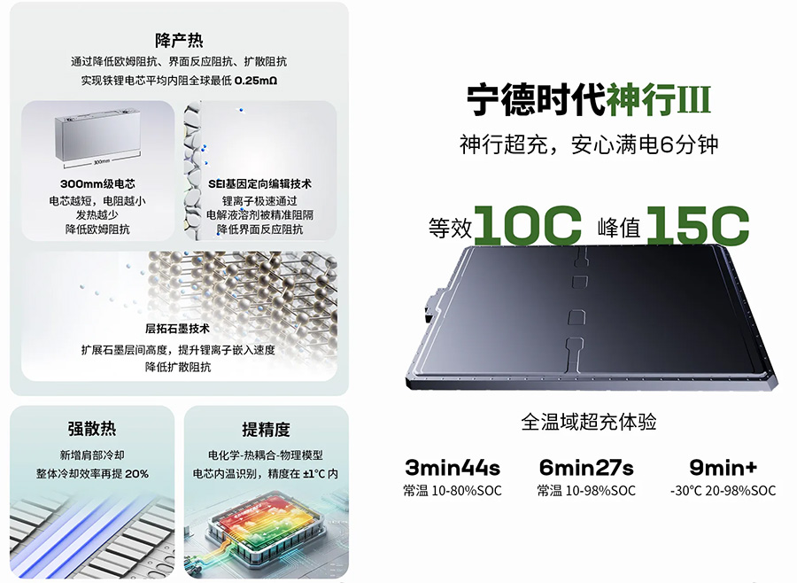 CATL заяви, че най-новата им LFP батерия постига световен рекорд по вътрешно съпротивление от 0,25 милиома, което е с около 50% по-ниско от средното, което помага за постигането на ултрабързи скорости на зареждане. За по-добра работа при студено време на всяка станция за бързо зареждане, батерията разполага с нова технология за самонагряване с импулси.