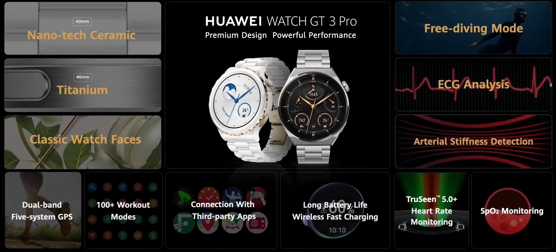 Няколко седмици след премиерата на часовниците Huawei Watch GT 3 Pro в Китай компанията е готова да ги предложи и на напия пазар. В серията има модели в два размера, което ги прави подходящи за дами и господа, а всеки от тях ще се предлага в няколко варианта според материала на каишката.