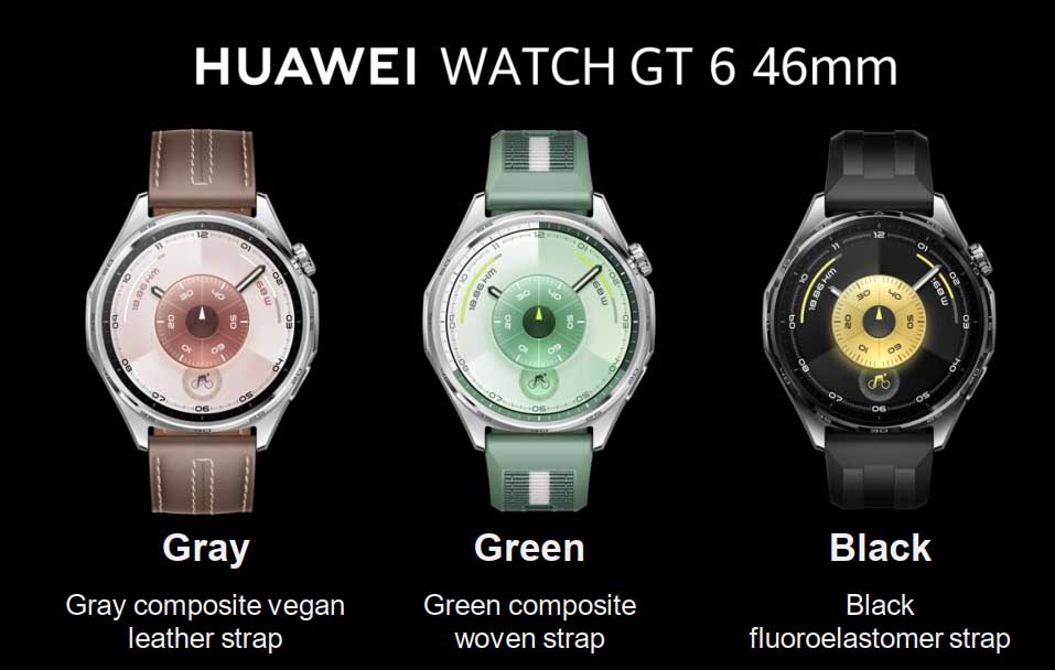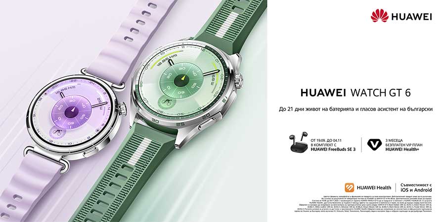 Watch GT 6 46 мм също се предлага в три варианта – черен, сребрист със зелени акценти и сребрист със сиви детайли около екрана. Тук каишките са черна от флуороеластомер, кафява от веган кожа и зелена композитна плетена каишка. По-малкият вариант, който ще допадне на дамите, в наличен в цели 5 цвята на корпуса – черен, бял, лилав, кафяв и златист, а към тях са добавени каишки от веган кожа, флуороеластомер, композитен материал с текстил и стоманена верижка с миланска плетка. Часовниците отново са съвместими с iOS и Android.