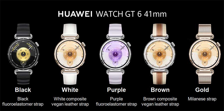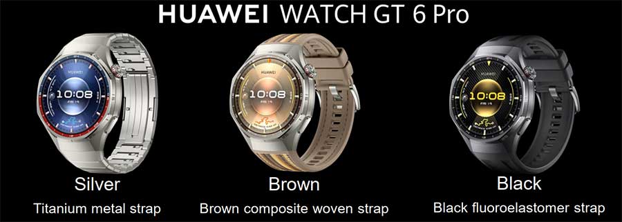 Серията Watch GT 6 се предлага в два варианта и в два размера. Watch GT 6 Pro е наличен само в размер 46 мм, а Watch GT 6 се предлага в размери 41 и 46 мм. Както обикновено компанията предлага часовниците в различни цветове и с различни каишки. Watch GT 6 Pro е наличен в черно, сребрист с кафяви акценти и сребристо с т.нар Pepsi акценти (синьо и червено) в комбинация съответно с каишка от черен флуороеластомер, кафява композитна плетена каишка и верижка от титанова сплав.