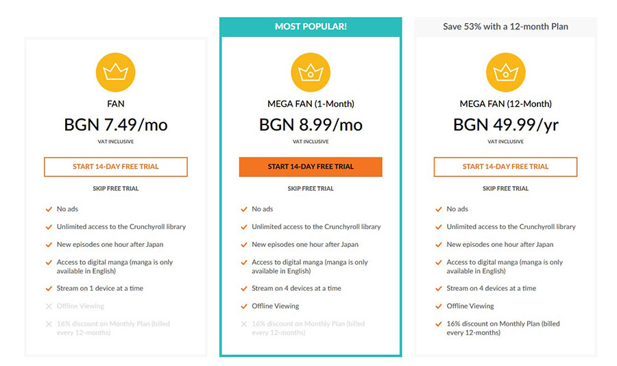 Не знаем каква е била досегашната цена на абонамента в България (може да оставите коментар, ако сте потребител), но според сайта на Crunchyroll план Mega Fan е на цена 8.99 лева месечно. Годишният абонамент е 49.99 лева, което намалява месечната цена до около 4 лв.