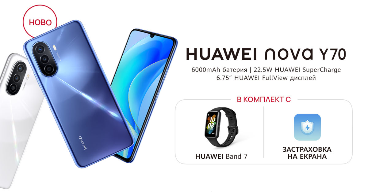 Новото попълнение в смартфон семейството на Huawei nova Y70, вече е наличен на българския пазар. До 14 август 2022 смартфонът се предлага в пакет със смарт гривната Huawei Band 7, и 6-месечна застраховка на дисплея, на препоръчителна крайноклиентска цена от 399 лева. Застраховката покрива една безплатна смяна на екран, счупен поради злополука (удар/изпускане/притискане).
