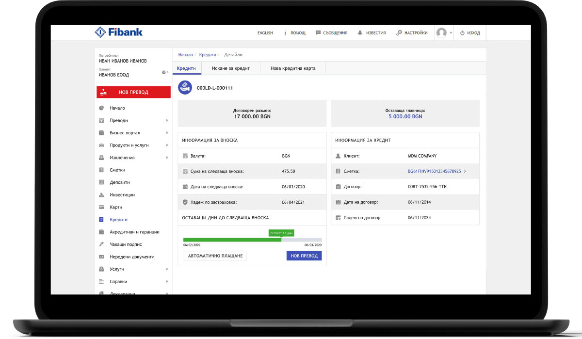 Разширената функционалност на кредитното меню на My Fibank носи и други полезни неща като например показване на детайлна информация за кредити на всички юридически лица. Могат да се видят детайли като договорен размер, оставаща главница, статус на кредита (редовен, просрочен до 90 дни и просрочен над 90 дни), дата и сума на следваща вноска, падеж по договор, статус по застраховка и оставащи дни до следваща вноска.