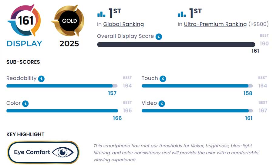 С впечатляващите 160 точки на второ място в глобалната класация се нарежда Google Pixel 10. DXOMARK изтъква, че с изключителна четливост, ярки, но естествени цветове и плавни взаимодействия, Pixel 10 предлага дисплей, който се конкурира с Pixel 10 Pro XL. По този начин Google Pixel 10 изравнява оценката на Samsung Galaxy S25 Ultra, който досега заемаше първото място в класацията за дисплеи.