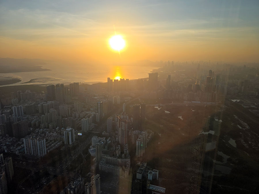 Денят завърши с посещение до Ping An Finance Centre – с височина 599.1 метра това е втората по височина сграда в Китай и петата в света. При подходящи условия от нея може да се види и Хонконг, което не успяхме да направим в този ден, но пък се качихме навреме за залеза, което направи преживяването още по-въздействащо. Късно вечерта се прибрахме уморени в хотела, но с очакване за следващия ден, който обещаваше още по-интересни преживявания и първия от двата вътрешни полета.