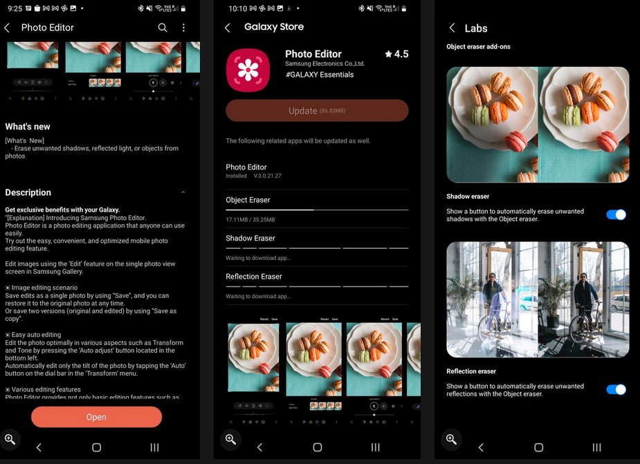 Те обаче ще бъдат добавени като обновление на Photo Editor, вместо да се използва актуализация на системния софтуер. За да ги използвате, трябва да имате най-новата версия на приложението, както и свързаните добавки object/shadow/reflection. Те са достъпни в секцията за обновление в раздел About Photo Editor.