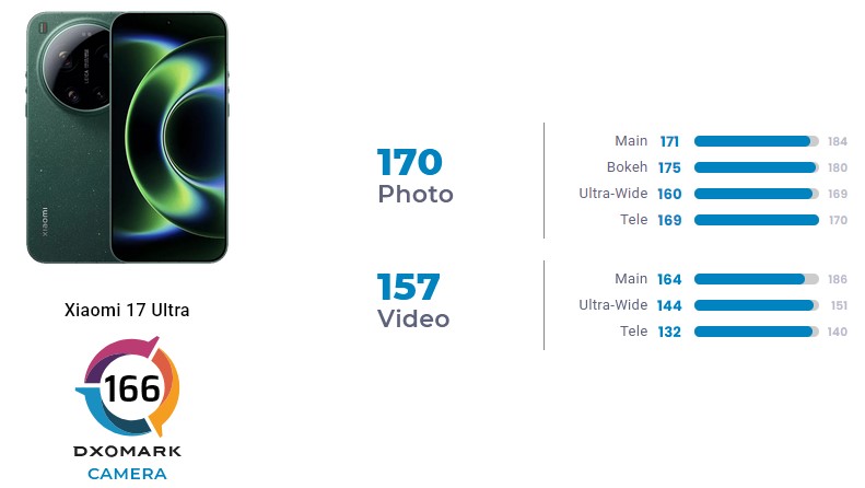 С резултат от 166 точки Xiaomi 17 Ultra се озова на 6-то място (наравно с Oppo Find X9 Pro) в общата класация на DXOMARK за камери, благодарение на изключителната производителност на основната камера и отличните резултати при слаба осветеност с запазване на детайлите.