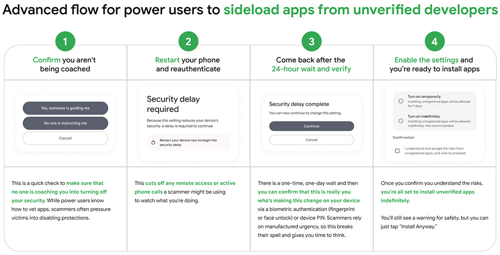 За потребителите, които все пак държат да инсталират софтуер от непотвърдени източници, Google въвежда нов, многостепенен процес, който изглежда е проектиран да бъде максимално тромав.