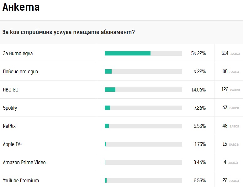 В последната ни анкета ви попитахме „За коя стрийминг услуга плащате абонамент?“, а резултатите от нея вече са ясни. Дали заради традиционния интерес у нас към телевизията или заради свободния достъп до торент тракери, повечето потребители отговарят, че не плащат абонаменти. 59.22% от респондентите, което представлява 514 души, са избрали тази опция като отговор.