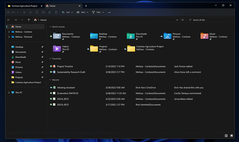 File Explorer получава обновен дизайн и според Microsoft използва облачни технологии. Благодарение на това потребителите ще имат достъп до всичките си файлове от едно място. Ще е възможно закачването на файлове и създаване на раздели, включително с бърз достъп до често посещавани папки.