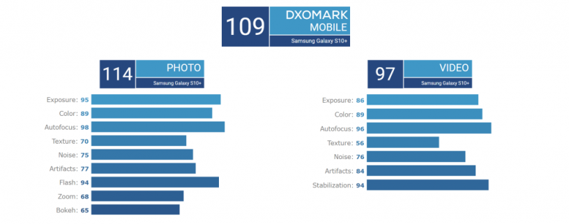 Samsung Galaxy S10+ заема първо място в създадената наскоро тестова система на DxOMark Selfie, в която се оценява качеството на заснемане с предната камера. Моделът дели и първото място по отношение на основната си камера при теста DxOMark Mobile с Huawei Mate 20 Pro и P20 Pro, като и трите устройства имат еднакъв брой точки – 109. Тестовете са в две категории – снимки и видео. В първата категория основната камера получава 114 точки, а при видео достига 97. За сравнение iPhone XS Max е с общ резултат 105 точки (110 за снимки и 96 за видео), а Pixel 3 със 101 (103/98).