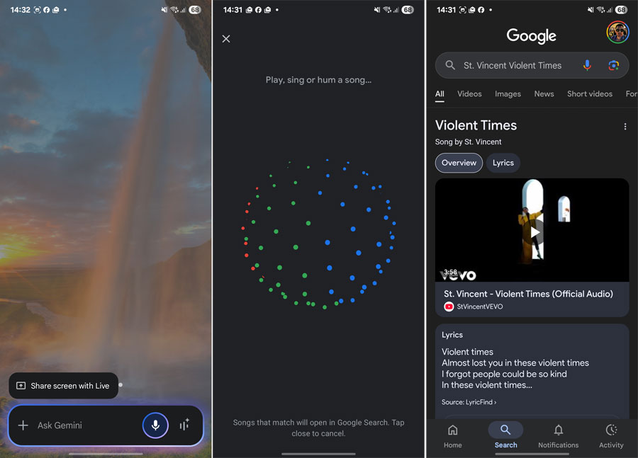 Преди спирането на на Google Assistant по-късно през годината приложението Gemini за Android вече може да разпознава песни с помощта на функцията Google Search. Доскоро отговорът на Gemini на въпроса „What song is that“ даваше отговор за използване на приложение за разпознаване на музика. На същия въпрос Google Assistant стартираше разпознаване и показваше резултата. Засега тази команда не се поддържа на български.