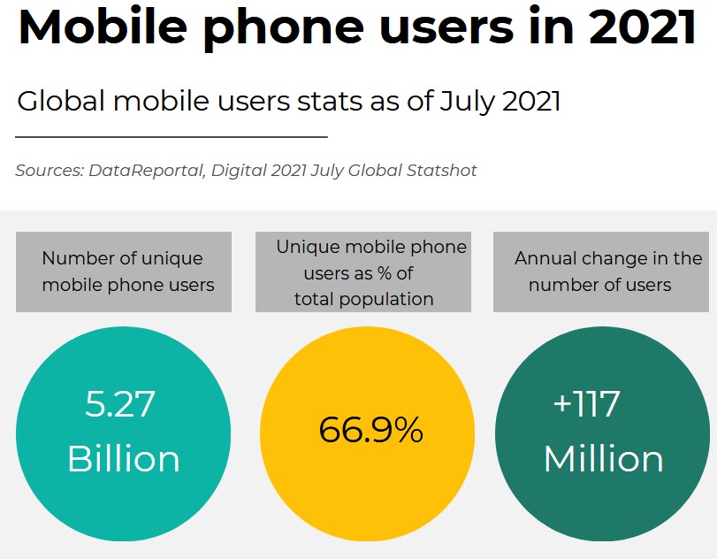 Трябва да отбележим, че 5.27 милиарда е броят на хората с поне един телефон, а някои потребители имат повече. 79% или 6.4 милиарда от всички устройства са смартфони, като от тях е осъществен 73% от общия трафик на данни. Ръстът в трафика на мобилни данни е с 68% на годишна база до 66 екзабайта през първото тримесечие на 2021. 73% от трафика е от смартфони с Android, а 26.3% от такива с iOS.
