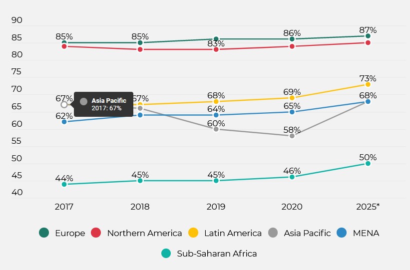 Подобна е и ситуацията в Северна Америка, а най-значително увеличение се очаква в Азиатско-тихоокеанския регион от 58% през 2020 до 68% през 2025. Най-нисък е делът на проникване на мобилните телефони в региона на Субсахарска Африка, 46% през 2020 с очаквания за достигане до 50% през 2025.
