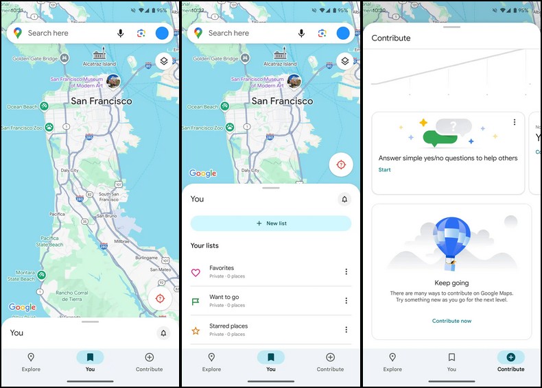 По-рано тази година Google започна тестове в Google Maps за Android на нов дизайн на два от основните раздели. Сега тези промени в секциите „Вие“ (You) и „Принос“ (Contribute) вече достигат до всички потребители.