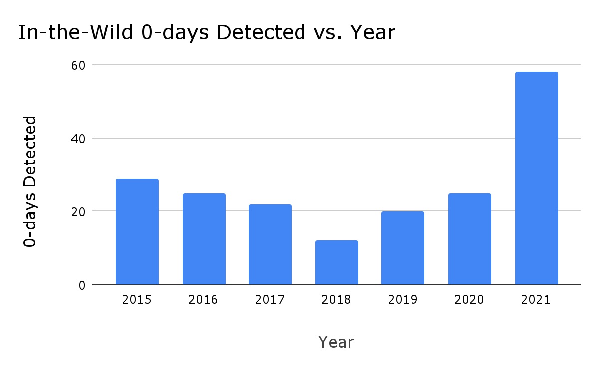 Google споделя интересни данни за този тип уязвимости през изминалата година, като тогава са открити 58 такива случая. Това е два пъти повече от откритите през 2020, 25 пропуска. Според компанията това се дължи на по-добрите възможности за откриване на проблеми от типа zero-day от компании като Microsoft, Apple, а и самата Google.