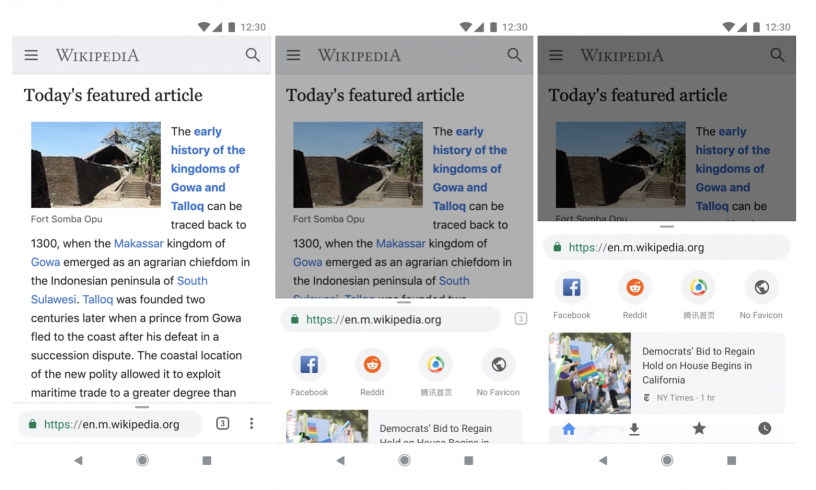 Опитът на Google от 2016 се нарича Chrome Home, като бившият interaction designer Крис Лий разказва в личния си сайт, че това е бил един амбициозен проект за промяна на основния потребителски интерфейс на браузъра. Той разказва, че с този експеримент toolbar-ът на Chrome е бил смъкнат долу и се е превърнал в панел, който изчезва и може да се плъзне за допълнителни контроли.