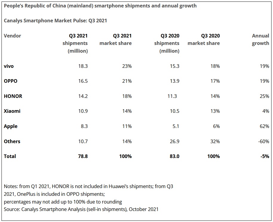 Лидери на пазара в страната са две компании от групата на BBK Electronics. vivo е на първо място с 18.3 милиона доставки и дял от 23%, следвана от Oppo (включително OnePlus) с 16.5 милиона доставки и дял 21%. Xiaomi вече е на четвърто място с доставени 10.9 милиона смартфона. Apple отчита ръст от 62% на годишна база до 8.2 милиона доставки.