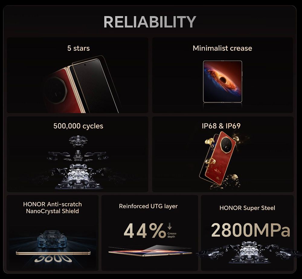 От инженерна гледна точка това е най-здравият сгъваем телефон на Honor до момента. Той разполага с нова Super Steel Hinge панта, изработена от най-здравата стомана, предлагана на пазара, и е тествана до 500 000 сгъвания и разгъвания в лабораториите на компанията.
