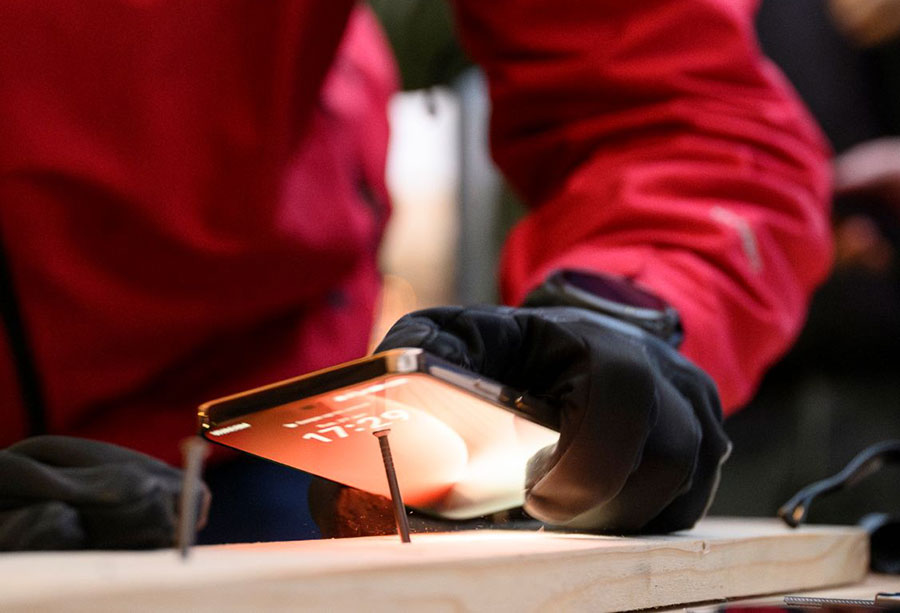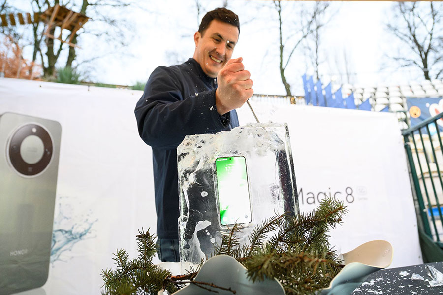 Фокусът на събитието бе поставен върху „неразрушимия“ дисплей и подсилената конструкция на Magic8 Lite. Смартфонът не просто „присъства“ на леда – той бе хвърлян върху твърдата повърхност, замразяван в леден блок и използван от журналисти като инструмент за забиване на пирони в дървена плоскост.