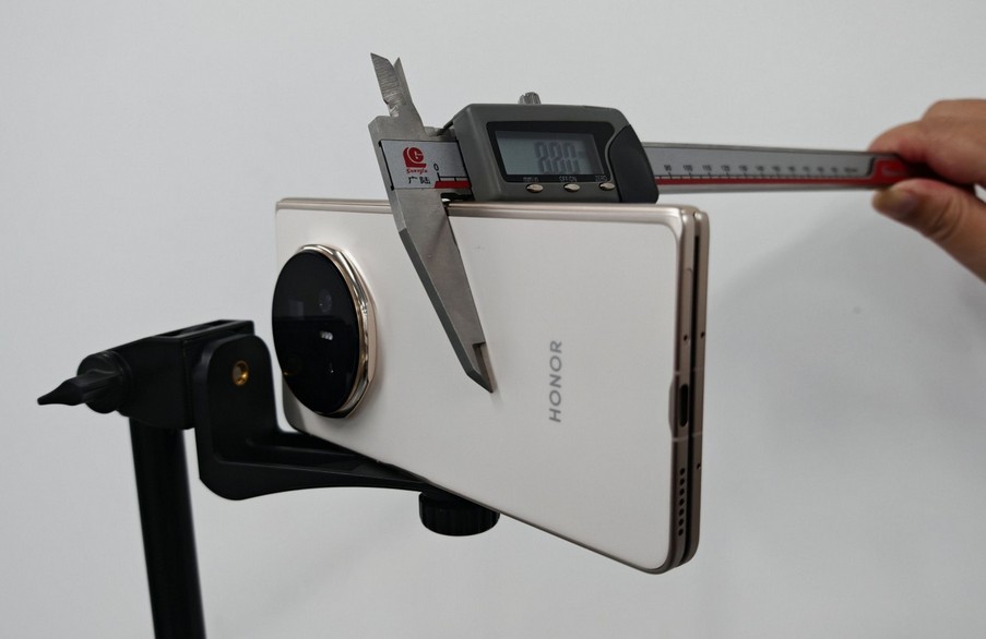 От своя страна Honor споделиха изображения, на които се използва шублер, за да се потвърди, че Magic V5 е с дебелина 8.80 мм, когато е сгънат, и 4.10 мм, когато е разгънат, както посочват и официалните данни.