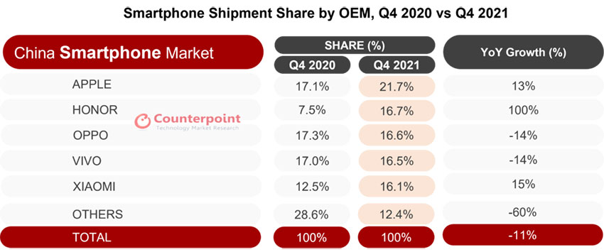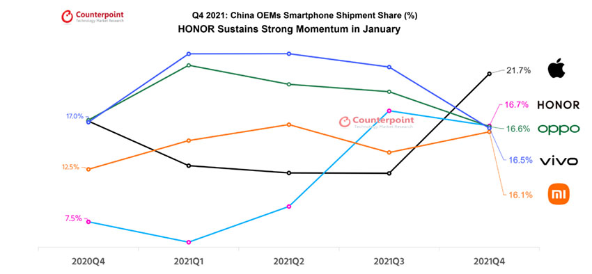 Нови данни на Counterpoint Research за пазара на смартфони в Китай през последното тримесечие на миналата година показват, че за първи път от отделянето като независима компания Honor е заела второто място по доставки. Първата позиция е за Apple с пазарен дал от 21.7% и увеличение на доставките с 13%.