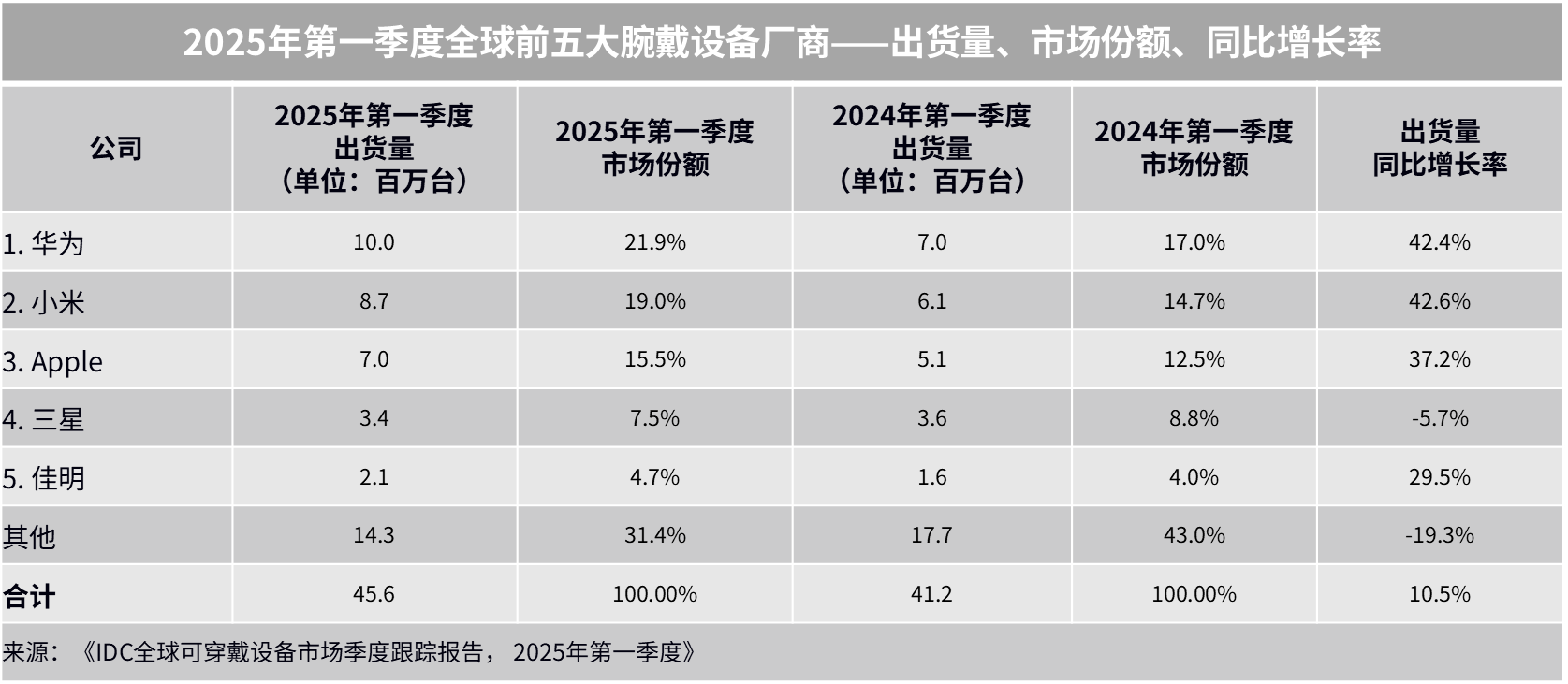Apple е на трето място със 7 млн. доставки и 15.5% пазарен дял. Тя отбелязва ръст от 37.2% спрямо резултатите си за първото тримесечие на 2024. Samsung е на четвърто място с 3.4 млн. продажби и 7.5% пазарен дял, като продажбите й са спаднали с 5.7%. В челната петица е и Garmin с 2.1 млн. доставки.