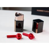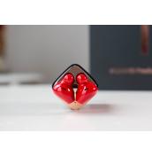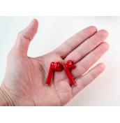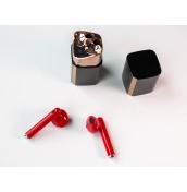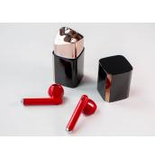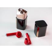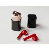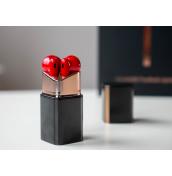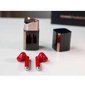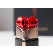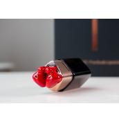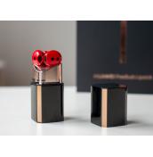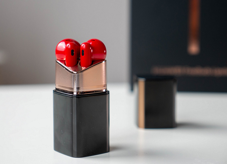 Кутийката има златиста лента върху единия ръб, която подсказва правилния начин за затваряне, а теглото оставя усещането за премиум продукт, което се допълва и от хладината на метала. Отдолу откриваме USB-C порт за зареждане и бутон за сдвояване на слушалките. При отваряне на кутийката виждаме златистото гнездо на слушалките, които са с ново наситено червено оцветяване, а това допълнително подсилва приликата с червило.