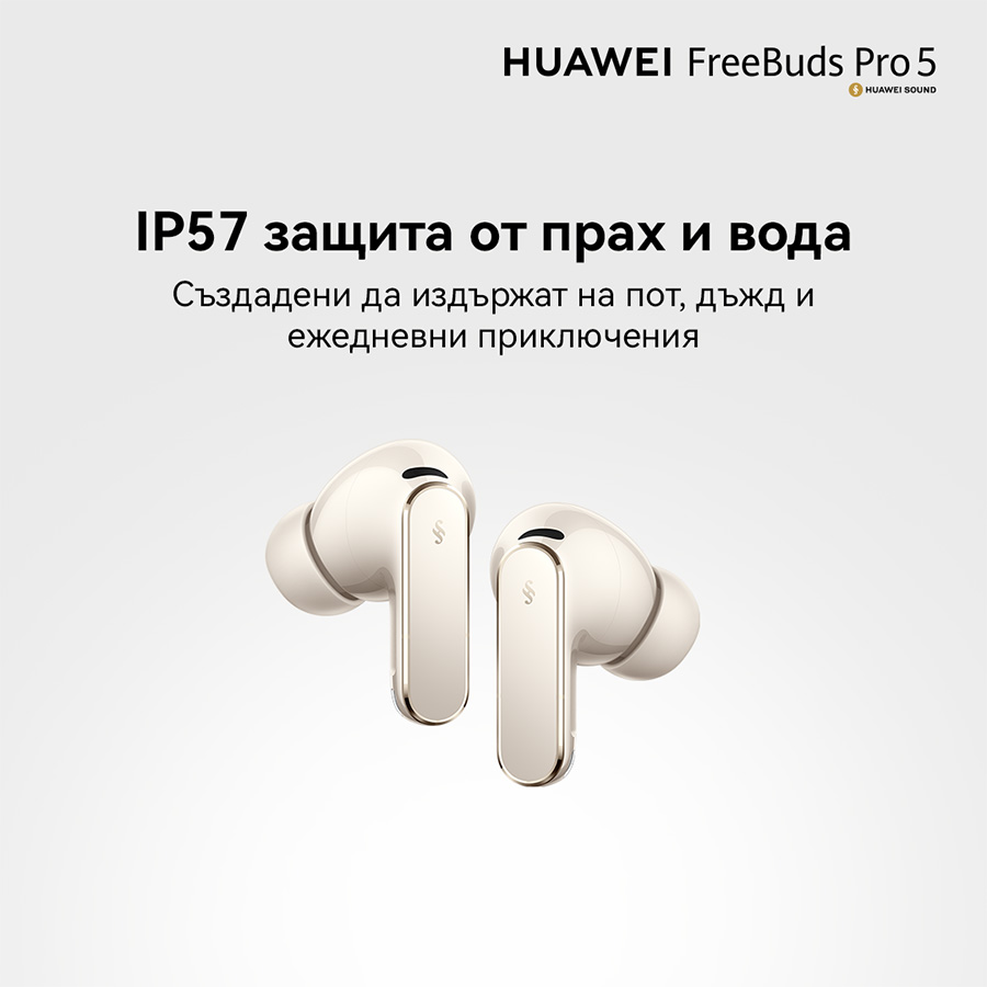 С ергономично и сигурно прилягане, слушалките следват естествените контури на ухото, като осигуряват стабилност, лекота и изключителен комфорт при различни форми на ушната мида. Освен това, Huawei FreeBuds Pro 5 разполагат с IP57 защита от прах и вода и са готови за разнообразни сценарии на употреба.